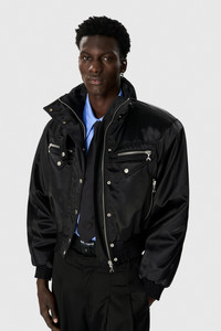 Boxy fit short-length bomber jacket with high neck and long sleeves Product Detail - Chin strap fixed with snap buttons - Invisible front zipper - Visible snap buttons - Two zipped pockets on chest and side with moon puller - Raglan shoulders with shoulder pads - Elasticated hem and cuffs with stitching details - Fully lined with nside pockets - Marine serre leather patch Composition and Traceability Product details page relating to environmental qualities or characteristics UJA068A_CWOV0068_BK99_BLACK Composition: Main Fabric: 40% Polyester , 30% Polyamide - Recycled , 22% Polyamide , 8% Polyurethane - Lining: 100% Viscose Product Care: Do not machine wash Do not bleach Low temperature iron on reverse side Dry clean with precaution Do not tumble dry Traceability: Weaving, Dyeing, Manufacturing: Italy