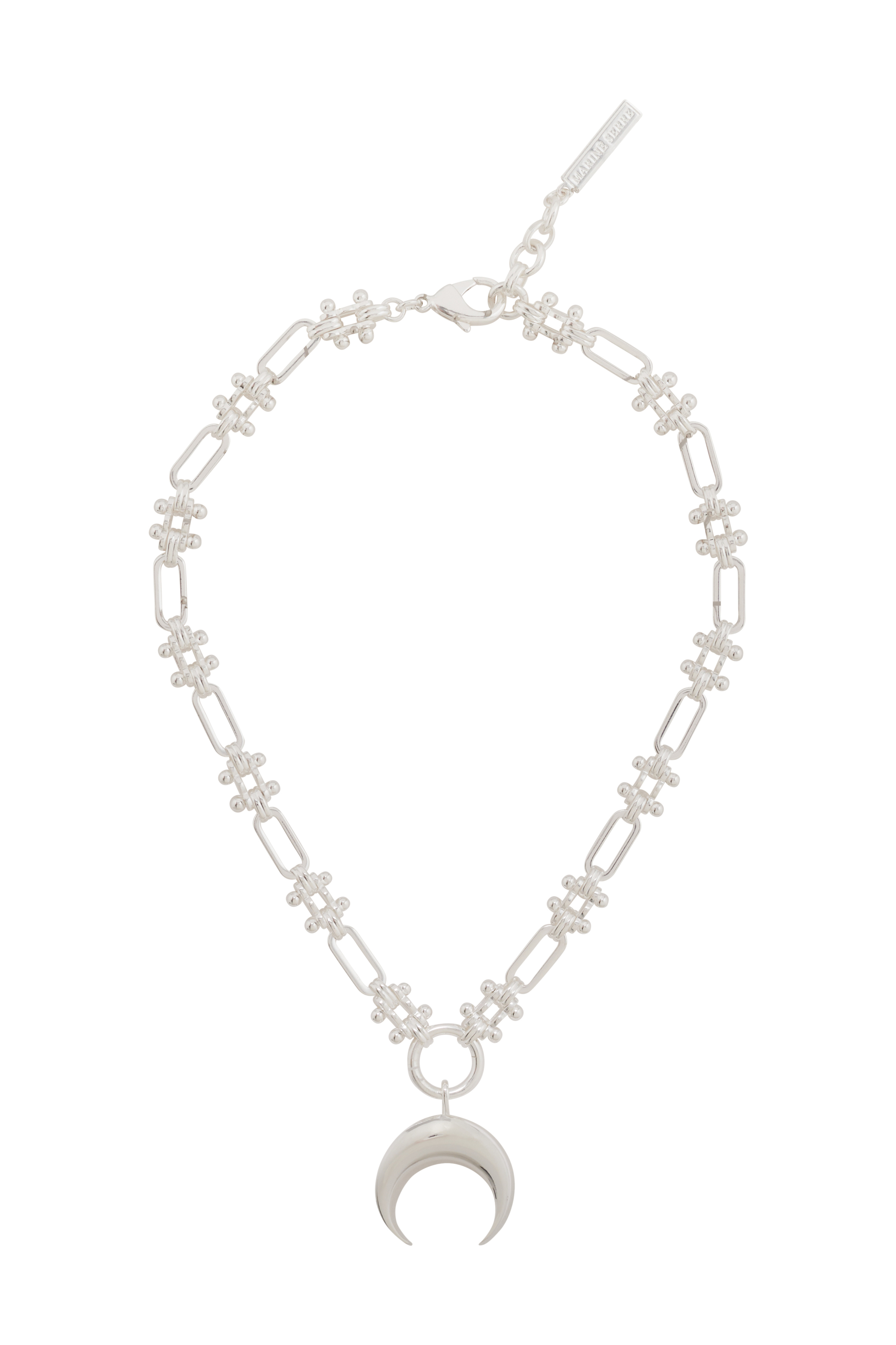 Chain necklace with signature Moon charm Product Detail - Oval and round link chain - Square clasp with three extension rings - Logo engraved on metal plate on last ring - 50 cm length Composition and Traceability Product details page relating to environmental qualities or characteristics UJW105A RMET0001 MT11 SHINY SILVER Composition: Base Material: 100% Brass - Plating: 100% Silver - Secondary Fabric: 100% Tin Traceability: Manufacturing: France
