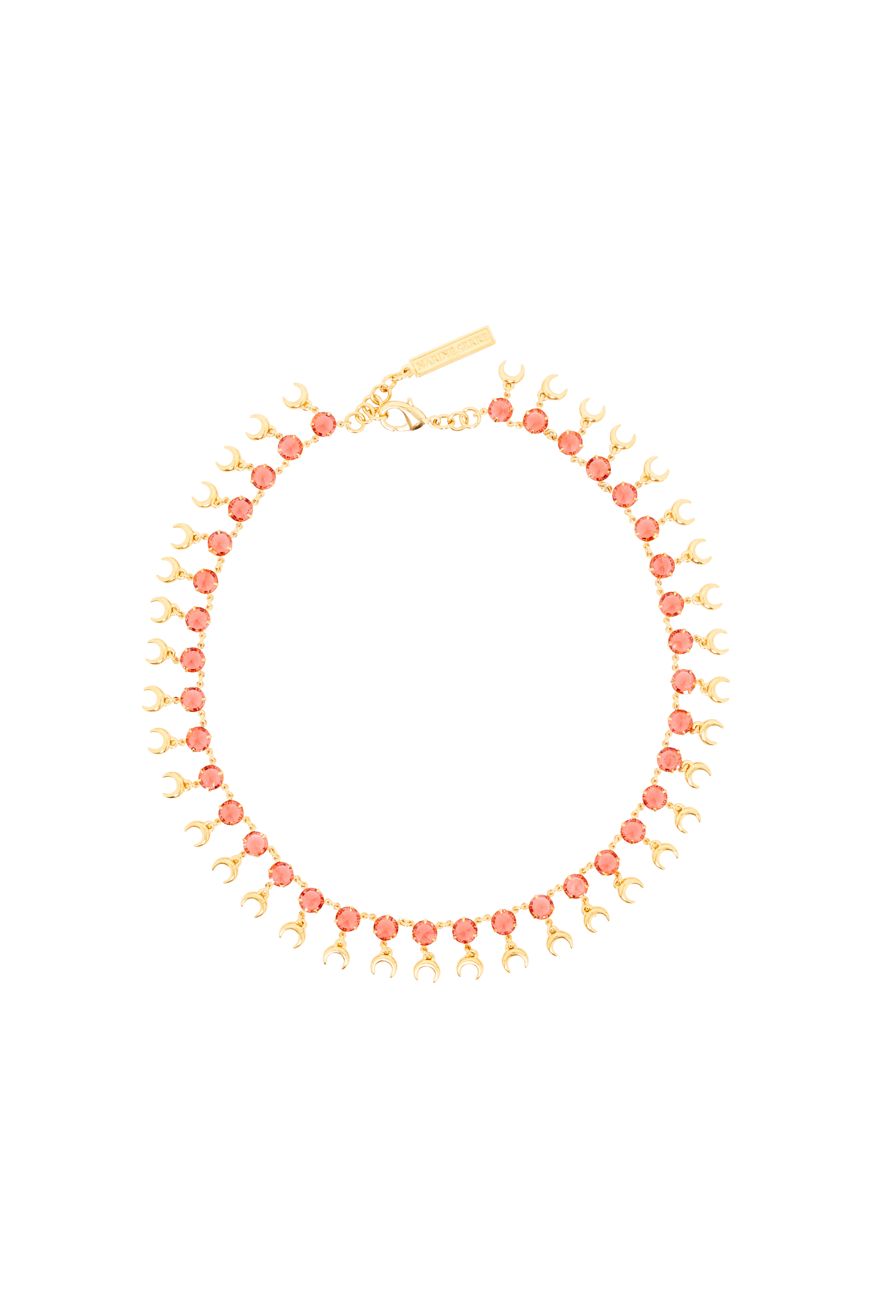 Multi rhinestone and moons necklace Product Detail - Galvanized Gold 0.5 - Small Moon pendants - 3 ring extension - Small Marine Serre plate on back Composition and Traceability Product details page relating to environmental qualities or characteristics UNE003A RMET0009 RD10 RED Composition: Base Material: 100% TIN - Plating: 100% GLD - Secondary Fabric: 100% CRY Traceability: Manufacturing: France
