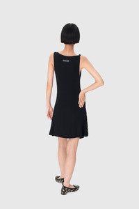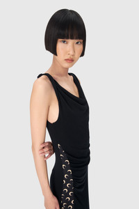 - Signature moon-printed side yoke - Twisted shoulder strap - Woven label with logo under neck in back Materials Black Jersey Often employed to structure the brand’s Hybrid pieces, recycled stretch jersey is continuously seen on wearable separates and accessories inspired by sportswear cuts. 78% Recycled Polyamide, 22% Elastane