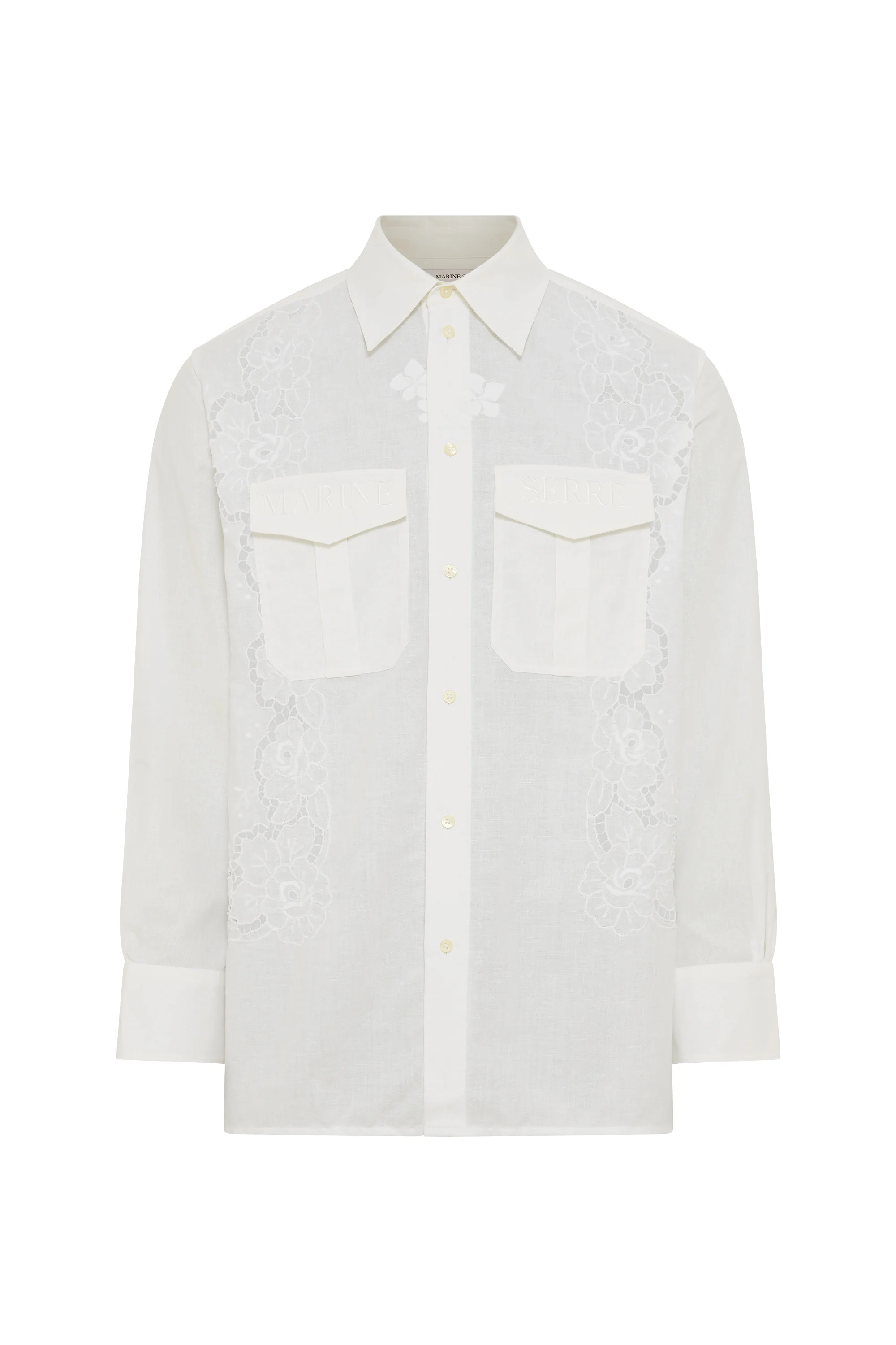 - Seven button front - Tailored sleeves with plackets and two button cuffs - Pleated gathers on bottom of sleeve cuffs - Twin extra-large army pleated pocket in front - Back yoke with back pleats - Logo embroidered on twin pockets Materials Household Linen White Material : Pillowcases From & Date of Sourcing : UK, 1960s Place of Transformation : France This extraordinary fabric is part of the core materials of the House. The forgotten techniques of the upcycled embroidered household linen are saved from oblivion and regenerated into unique, transcending garments evoking soft, delicate and sensual imagery. All these one-of-a-kind pieces are filled with history through their embroideries, all smoothly placed to highlight the beauty of this rare fabric. The white tones of the pillowcases are also dyed in black to play with the ceremonial references. 100% Cotton