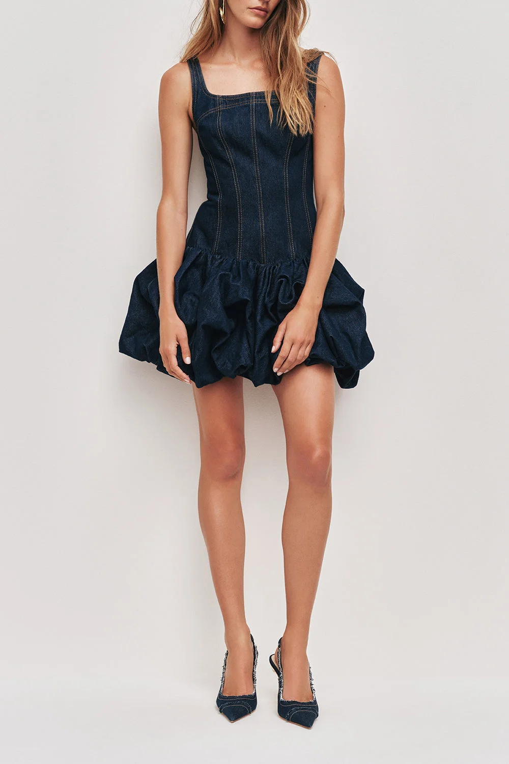 DETAILS AND INSIGHT Aje briar mini dress in indigo wash. 100% Cotton, 13 Oz // Width 59" Dry Clean Made In China Style 26RE5180-INDIGO WASH
