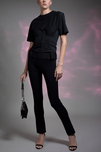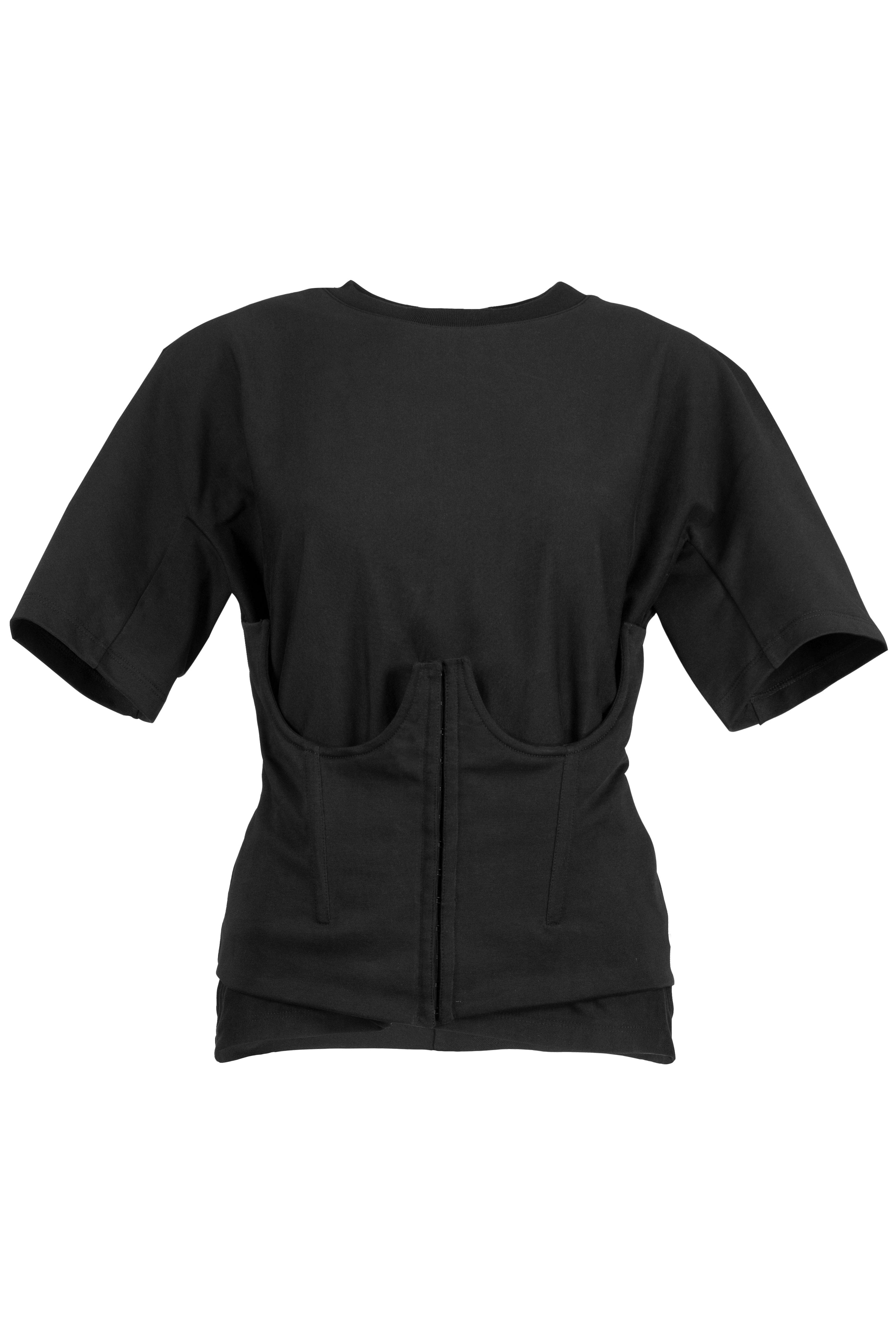 DETAILS AND INSIGHT Alaïa corset short sleeve t-shirt in noir. 100% Cotton Dry Clean Made in Italy Style AA9H02771J017