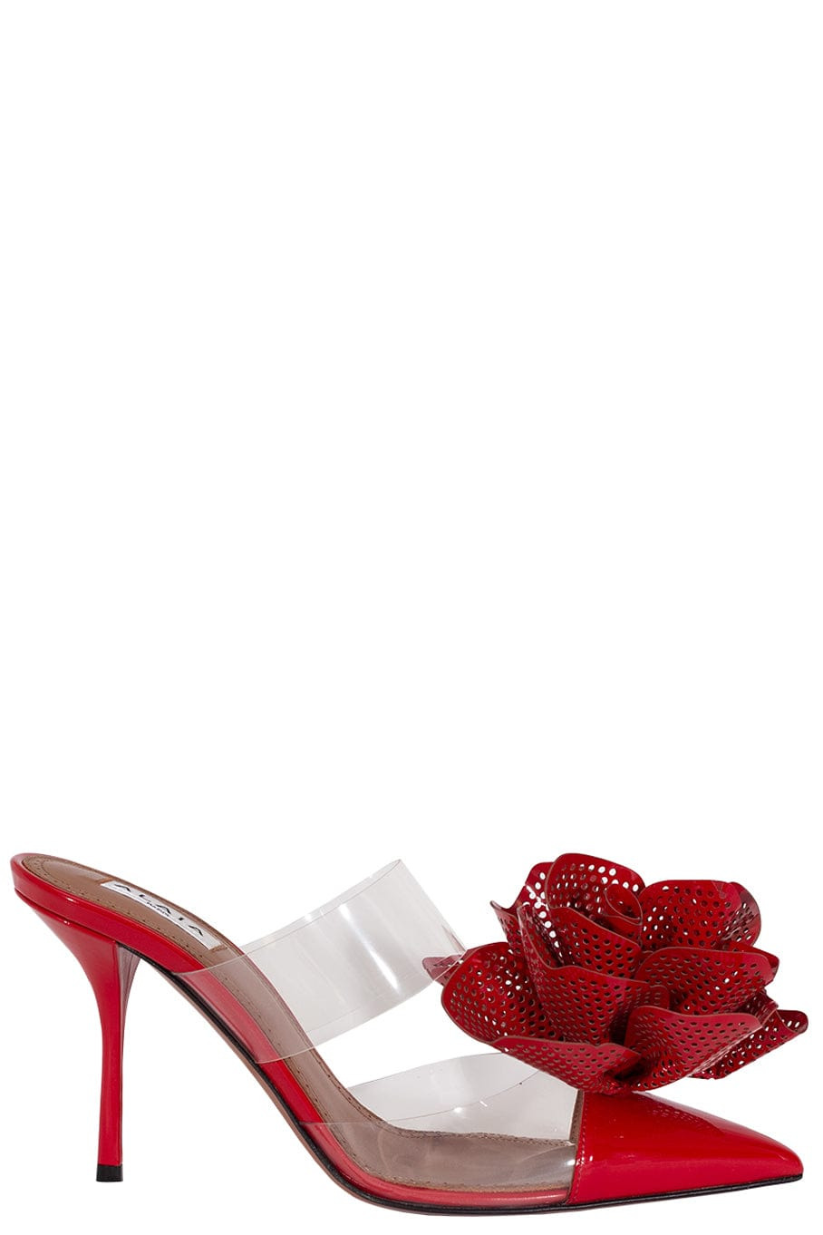 DETAILS AND INSIGHT Alaïa mule fleur mule in laque. Heel Height: 90mm 100% PVC Upper, 100% Leather Sole Made in Italy Style AA3M055CK151
