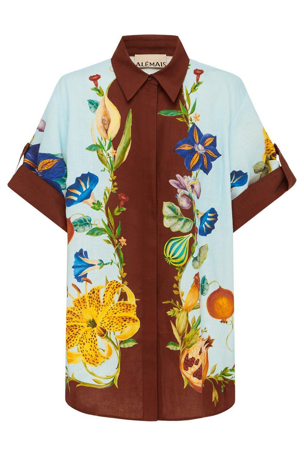 DETAILS AND INSIGHT Alemais dahlia shirt in multi. 100% EUROPEAN FLAX LINEN Dry clean Made in China Ships by Jan. 14 Style 4359T-MULTI