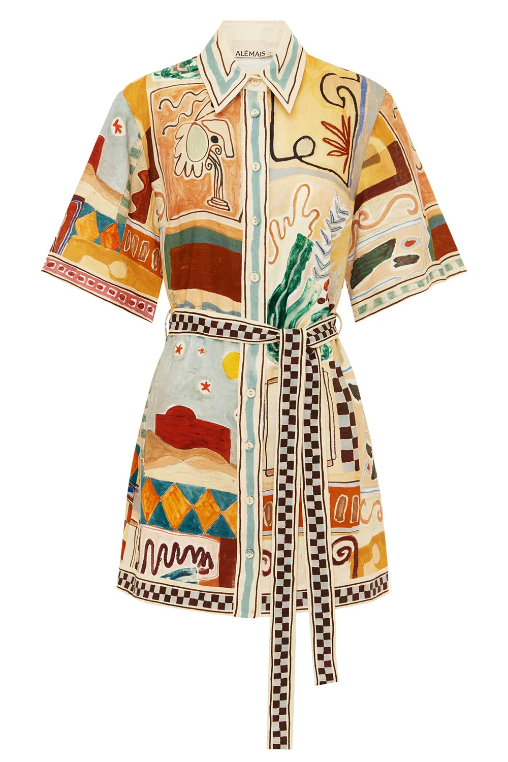 DETAILS AND INSIGHT Alemais michelle mini dress in multi. Removable Belt 100% European Linen Hand Wash Made In China Style 6308D-MULTI