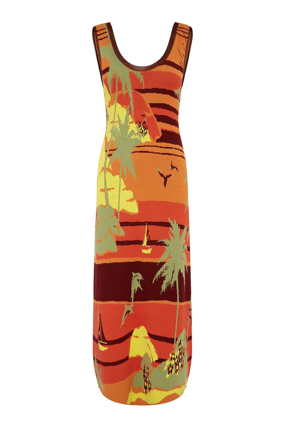 DETAILS AND INSIGHT Alemais palm island midi dress in multi. 72% Viscose 28% Pbt Hand Wash Made In China Style 4708K-MULTI