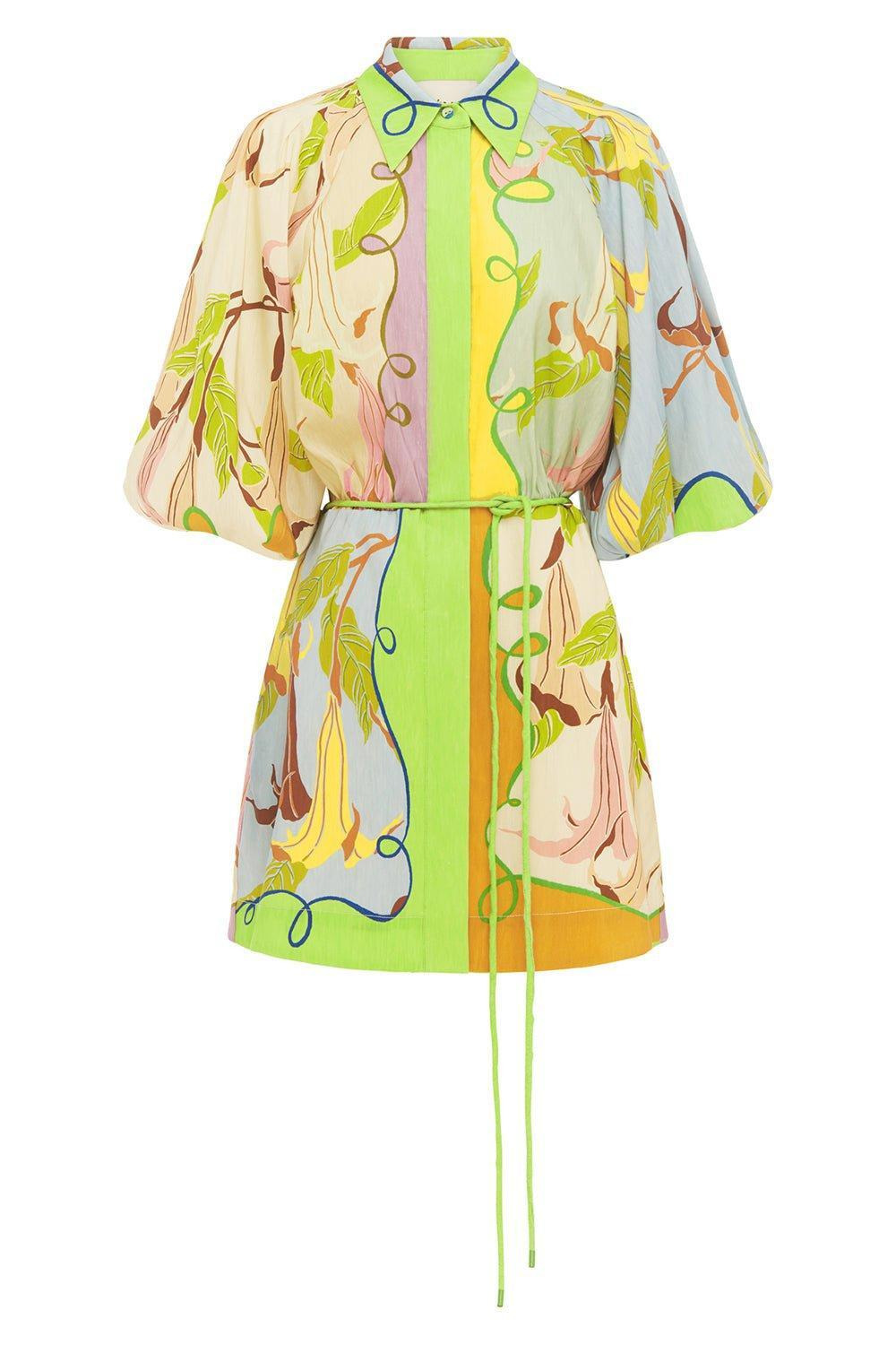 DETAILS AND INSIGHT Alemais rafaela mini dress in multi. 66% FSC VISCOSE 34% LINEN Dry clean Made in China Style 4270D-MULTI