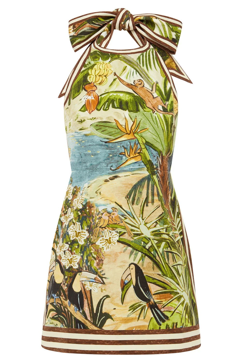 DETAILS AND INSIGHT Alemais toucan tango halter mini dress in multi. 100% Organic Cotton Handwash Only Made In China Style 6994D-MULTI