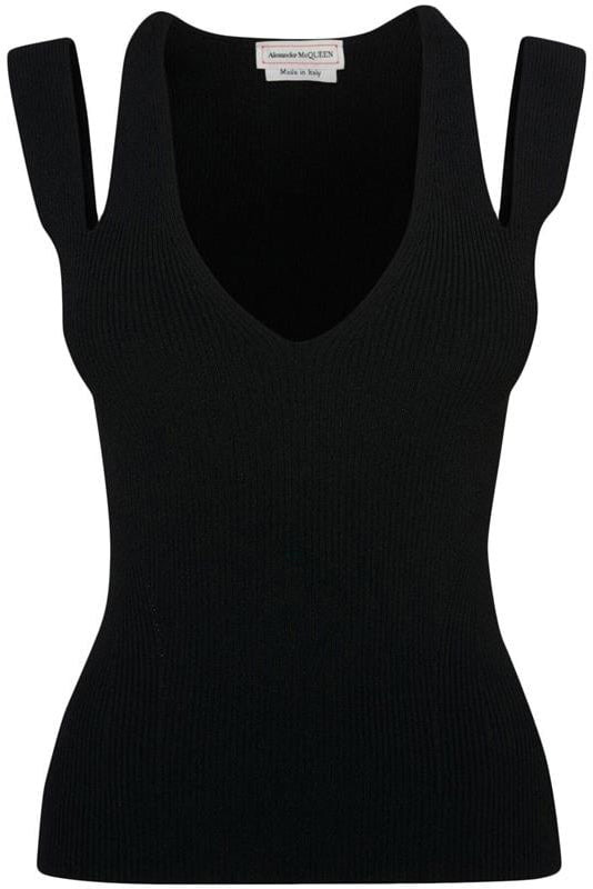 DETAILS AND INSIGHT Alexander McQueen cutout vneck top in black. T VISCOSE 83% Dry Clean Made in Italy Style 734542-Q1A5I-1000