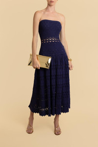 DETAILS AND INSIGHT Alexis payge dress in navy. The Payge Dress Is A Strapless Silhouette Featuring Tiered Knit Eyelet Detailing Throughout. Cotton Dry Clean Imported Style A2250405-0615-NAVY