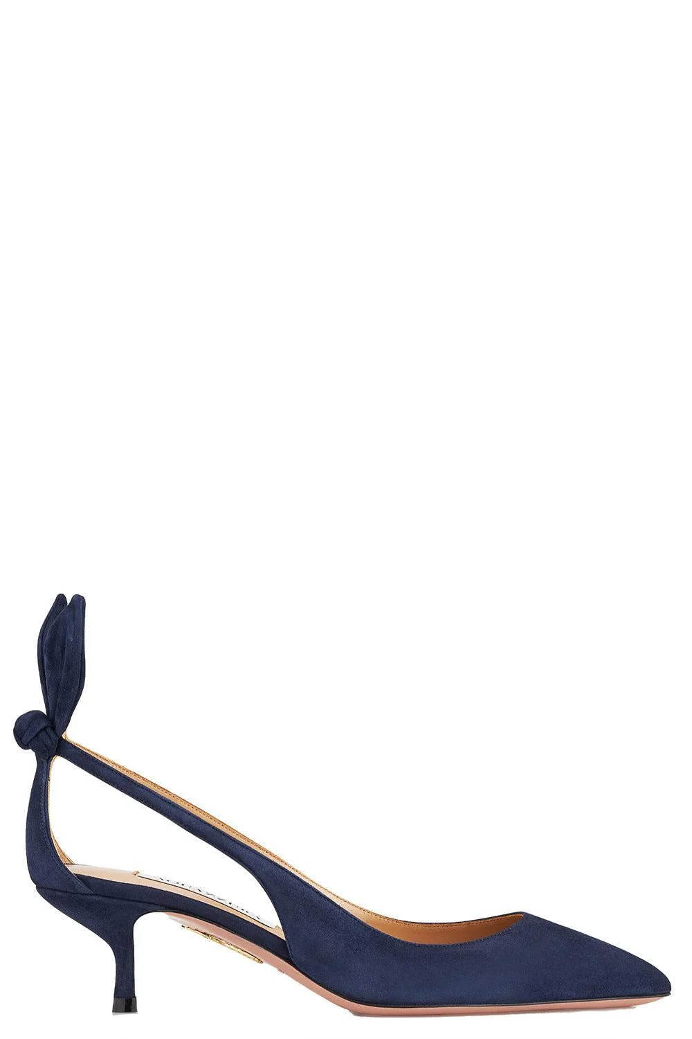DETAILS AND INSIGHT Aquazzura bow tie pump 50 in mezzanotte. Upper: 100% Kid Suede Leather (Capra Hircus Linnaeus) – Origin Italy – Farmed. Sole: 100% Calf Leather (Bos Taurus) – Origin France – Farmed. Lining: 100% Goat Leather (Capra Hircus Linnaeus) – Origin Bangladesh – Farmed Heel Height: 50mm Made In Italy Style DENMIDP2-SUE-MZN