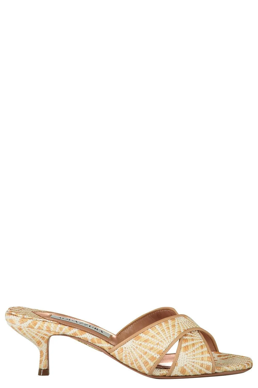 DETAILS AND INSIGHT Aquazzura divine mule 50 in natural. Shell Raffia/Nappa Heel Height: 50mm Made In Italy Style DVEMIDM1-SLP-NAT