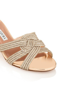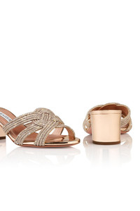 DETAILS AND INSIGHT Aquazzura felix mule 50 in rose gold. Heel Height: 50mm Upper: 100% Crossbred Leather (Ovis Aries Aries + Capra Hircus Linnaeus) - Origin South Africa - Farmed Partially Covered With Ornament (50% Crystal/50% Plastic).Sole: 100% Calf Leather (Bos Taurus) - Origin France - Farmedlining: 100% Goat Leather (Capra Hircus Linnaeus) - Origin India - Farmed. Made In Italy Ships By Aug 7 Style FXCMIDM0-ROG