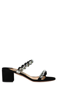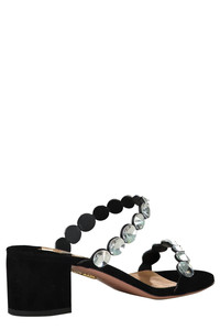 DETAILS AND INSIGHT Aquazzura maxi tequila sandal in black. Suede, Leather Heel Height: 50mm Made in Italy Style MXQMIDS0-SUE - 000