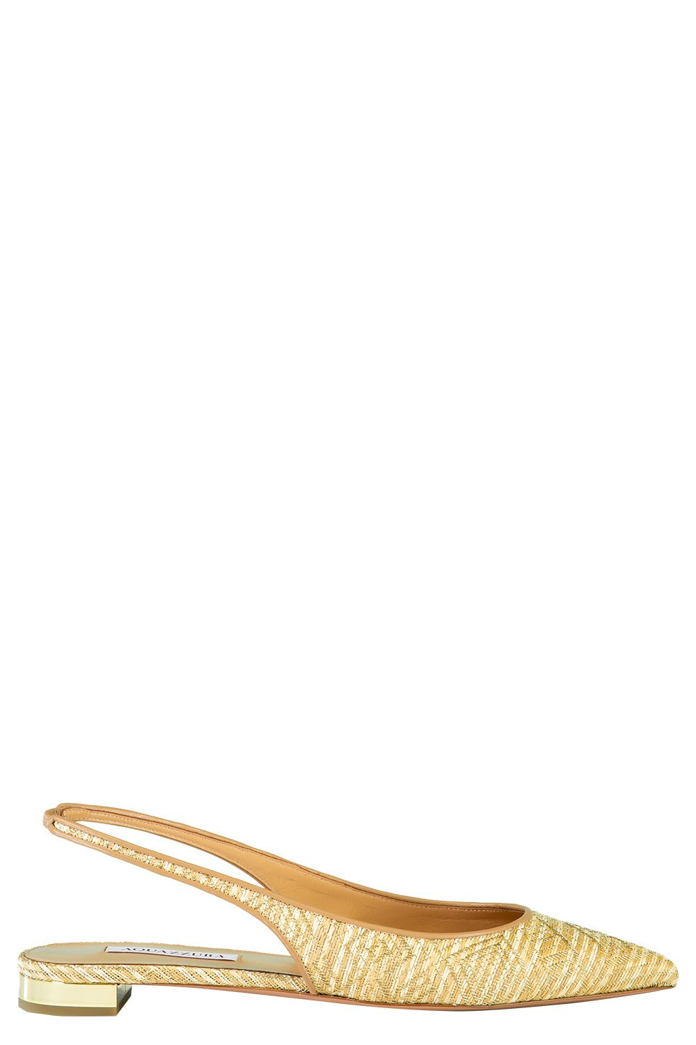 DETAILS AND INSIGHT Aquazzura purist sling flat in natural/platino. ELECTRIC RAFFIA/NAPPA Made in IT Style PURFLAL0-ERN-NTP