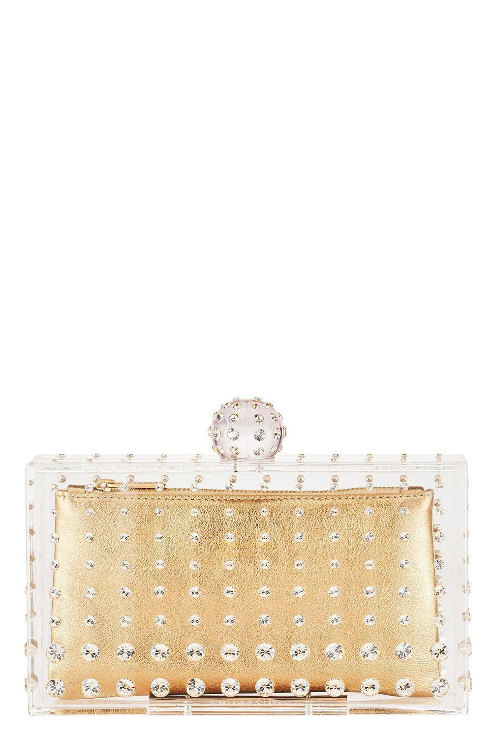 DETAILS AND INSIGHT Aquazzura tequila clutch in gold transparent/soft gold. RESIN/NAPPA LAMINATA/STRASS/BRASS Length: 4.3in x Width: 7.5in x Depth: 1.8in Fits Iphone 15 Pro Max Made in Italy Style TQLCLUC0-RNS - LGT