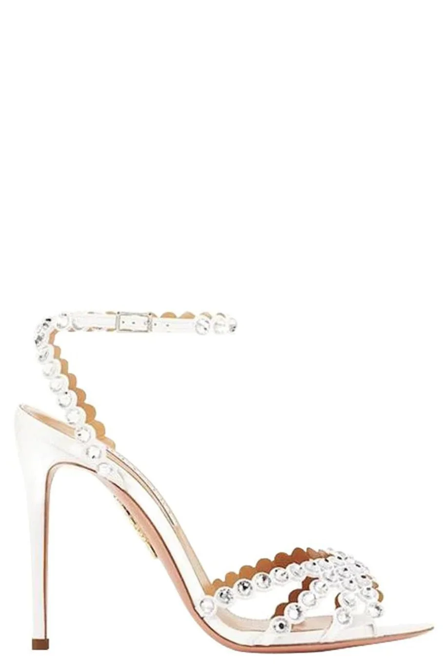 DETAILS AND INSIGHT Aquazurra tequila sandal 105 in white. Material: NAPPA LEATHER Heel Height: 105mm Made in Italy Style TQLHIGS0-NAP-FFF