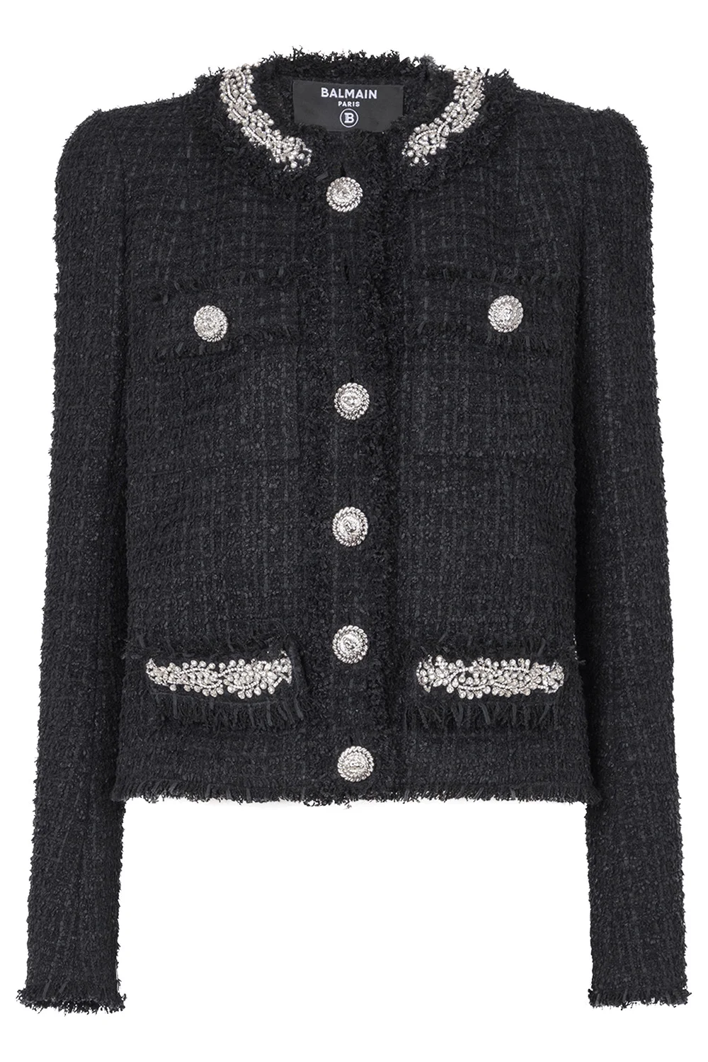 DETAILS AND INSIGHT Balmain embellished collarless side to side jacket in noir/crystal. 100% POLYAMIDE Professional Clean Made in SLOVAKIA Style DF0SK457PC64-EAW