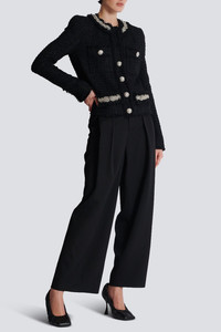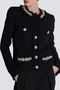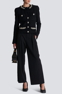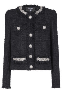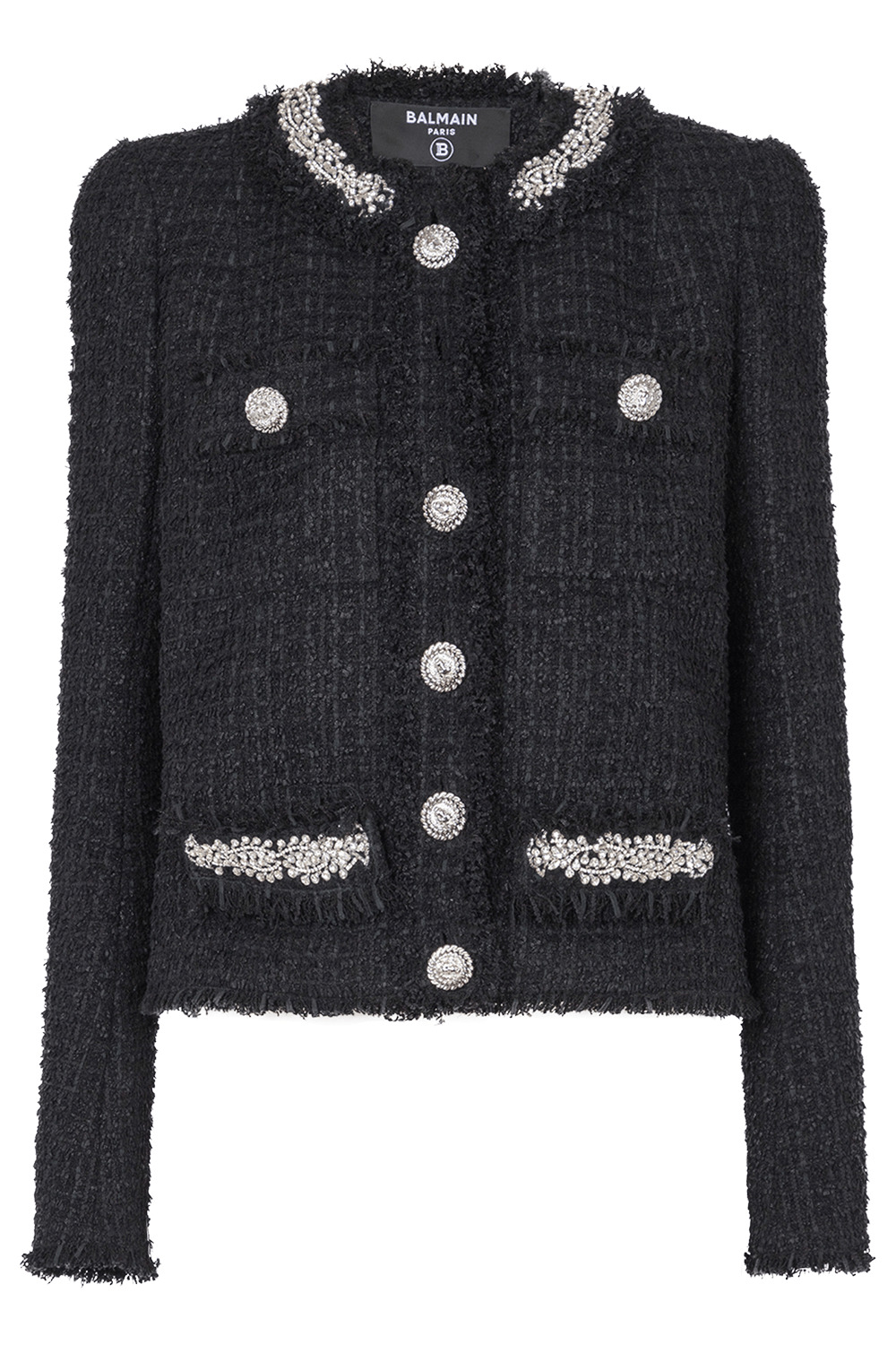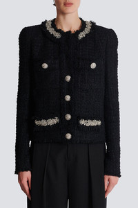 DETAILS AND INSIGHT Balmain embellished collarless side to side jacket in noir/crystal. 100% POLYAMIDE Professional Clean Made in SLOVAKIA Ships by Nov 7 Style DF0SK457PC64-EAW