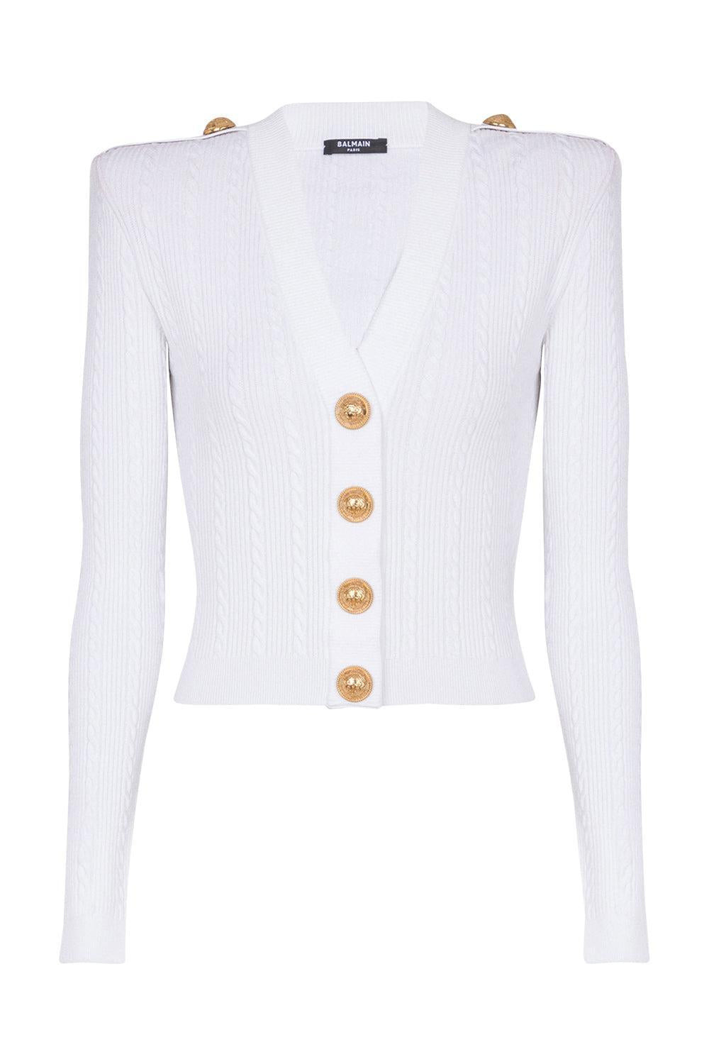 DETAILS AND INSIGHT Balmain four button cardigan in blanc. 83% Viscose, 17% Polyester Dry Clean Made in France Style FF1KL245KI50-OFA