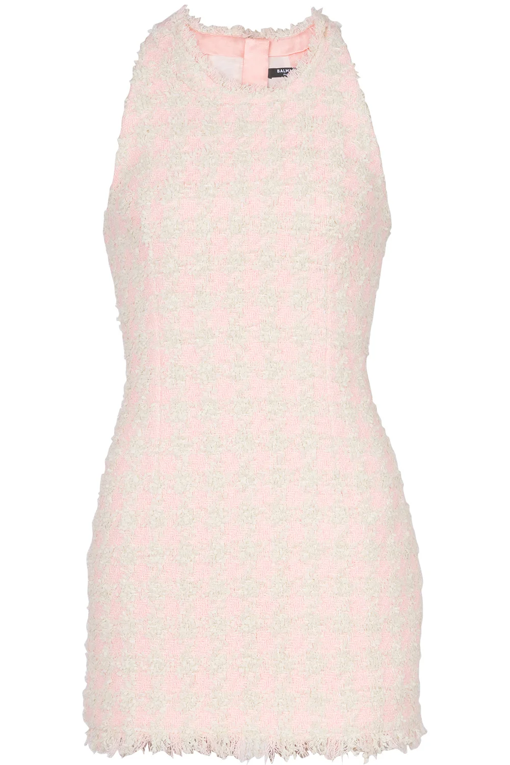 DETAILS AND INSIGHT Balmain halterneck sleeveless short dress in rose/beige. 100% VISCOSE Professional Clean Made in ITALY Style EF1R3295XK69-ROSE/BEIGE