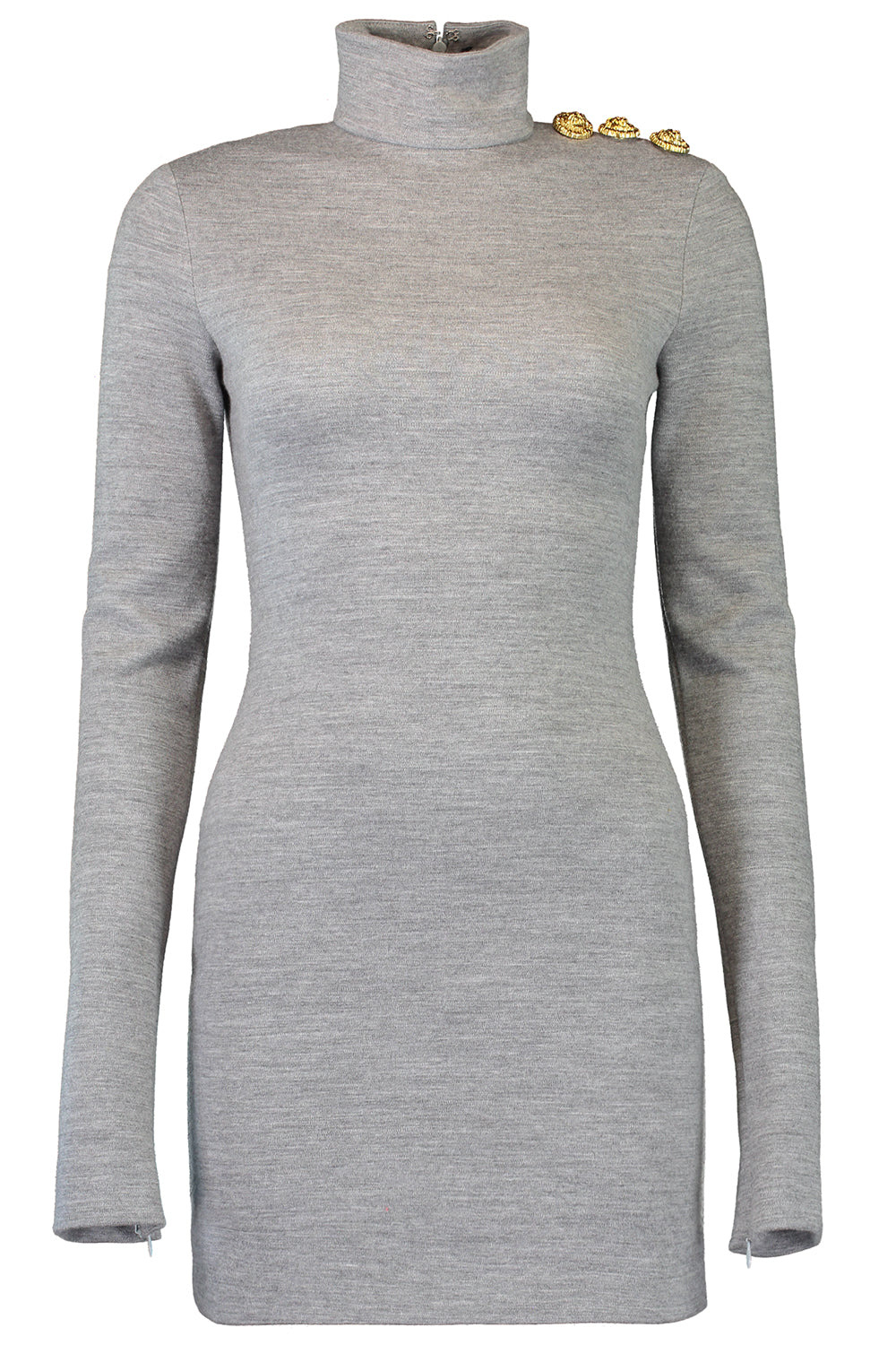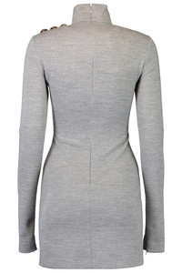 DETAILS AND INSIGHT Balmain long sleeve button short dress in gris chine clair. 50% Virgin Wool ; 47% Cotton ; 3% Polyamide Professional Clean Made In Portugal Style FF0R8895JL17-9AD