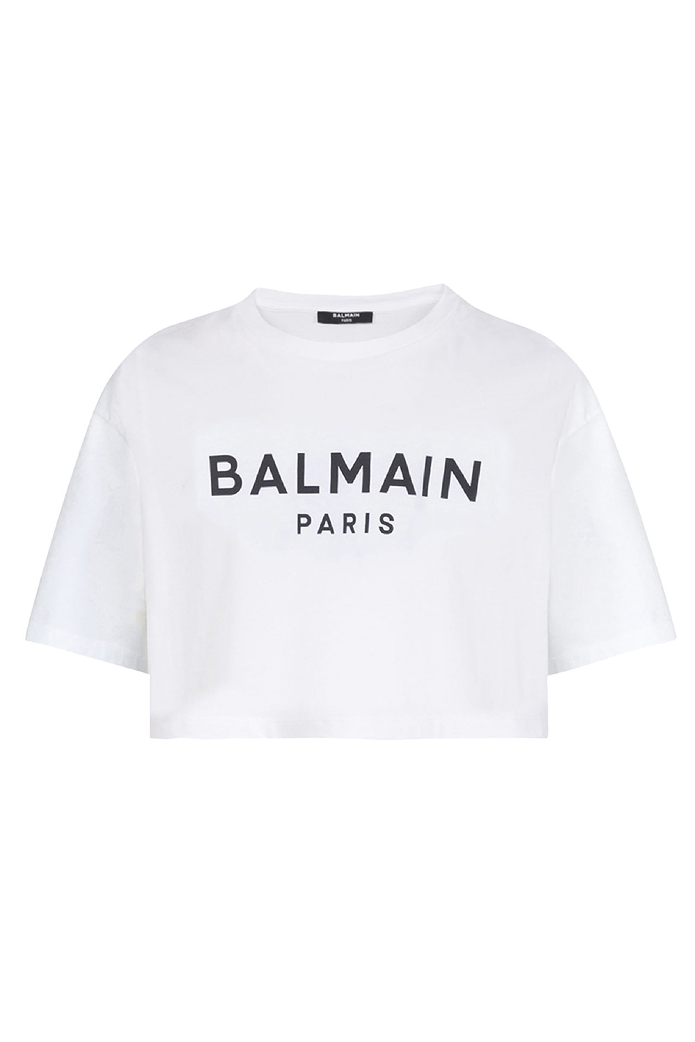 DETAILS AND INSIGHT Balmain printed crop tee in blanc/noir. 100% COTTON Professional Clean Made in Portugal Style BF1EE020BB02-BLANC/NOIR