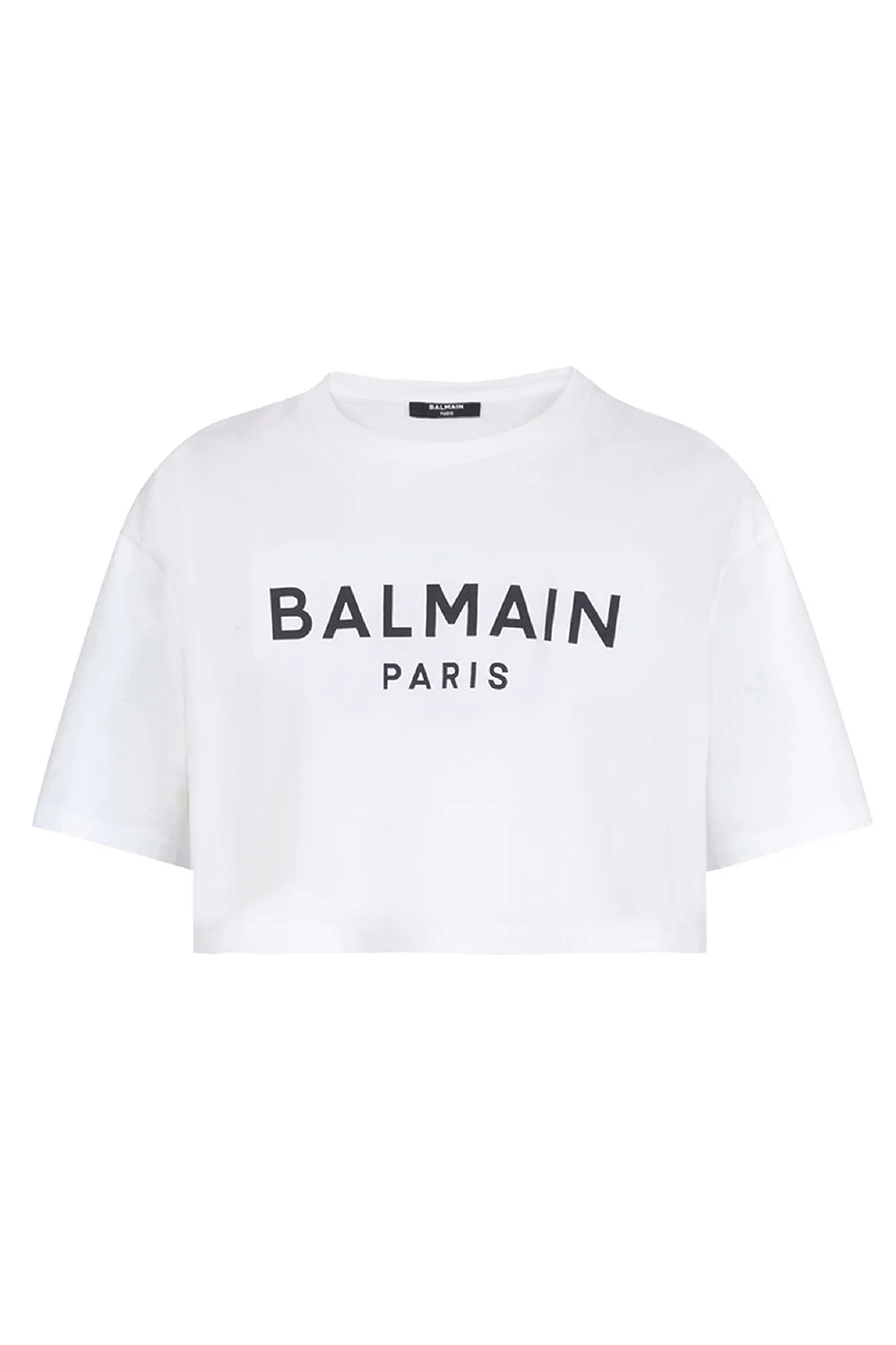 DETAILS AND INSIGHT Balmain printed crop tee in blanc/noir. 100% COTTON Professional Clean Made in Portugal Style BF1EE020BB02-BLANC/NOIR