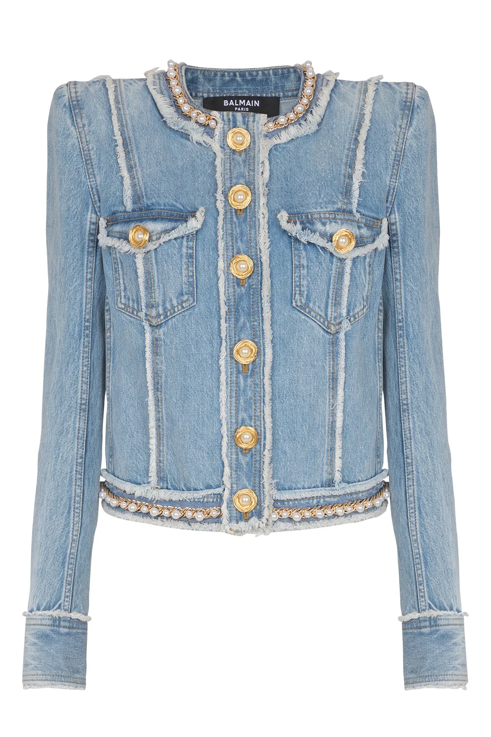 DETAILS AND INSIGHT Balmain raw edge denim jacket in bleu jean clair/or/blanc. 65% Polyester, 35% Cotton Professionally Clean Made In Romania Style EF0SK81075DF-SPS