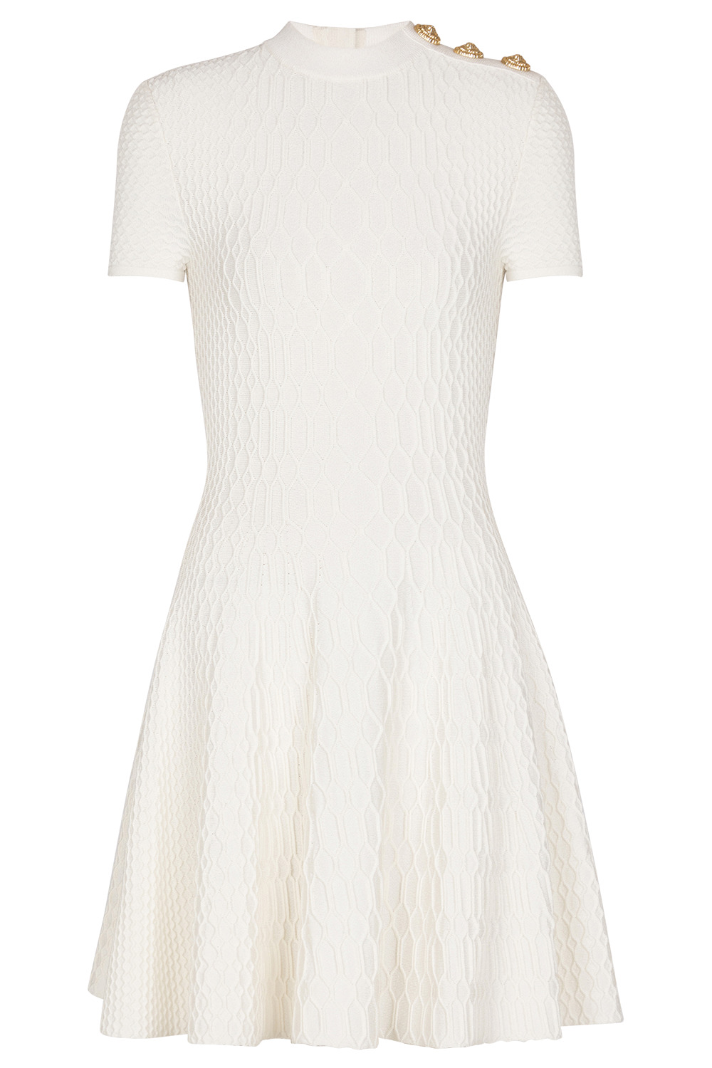 DETAILS AND INSIGHT Balmain three button flare dress in naturel. 85% Viscose ; 15% Polyester Professional Clean Made In Italy Ships by Nov 7 Style FF0R7151KJ03-0KA