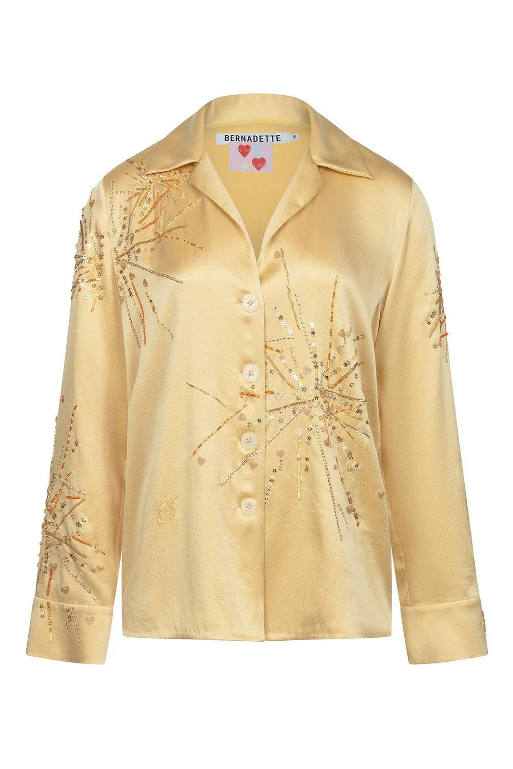 DETAILS AND INSIGHT Bernadette louis pyjama blouse in gold sequins sparkle embroidery on yellow. 92% Se 8% Ea Dry Clean Only Made In India Style PS26-RTW-PJB-LOU-EMB-SE-G59