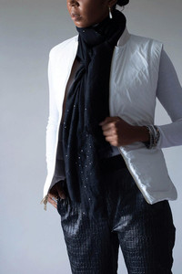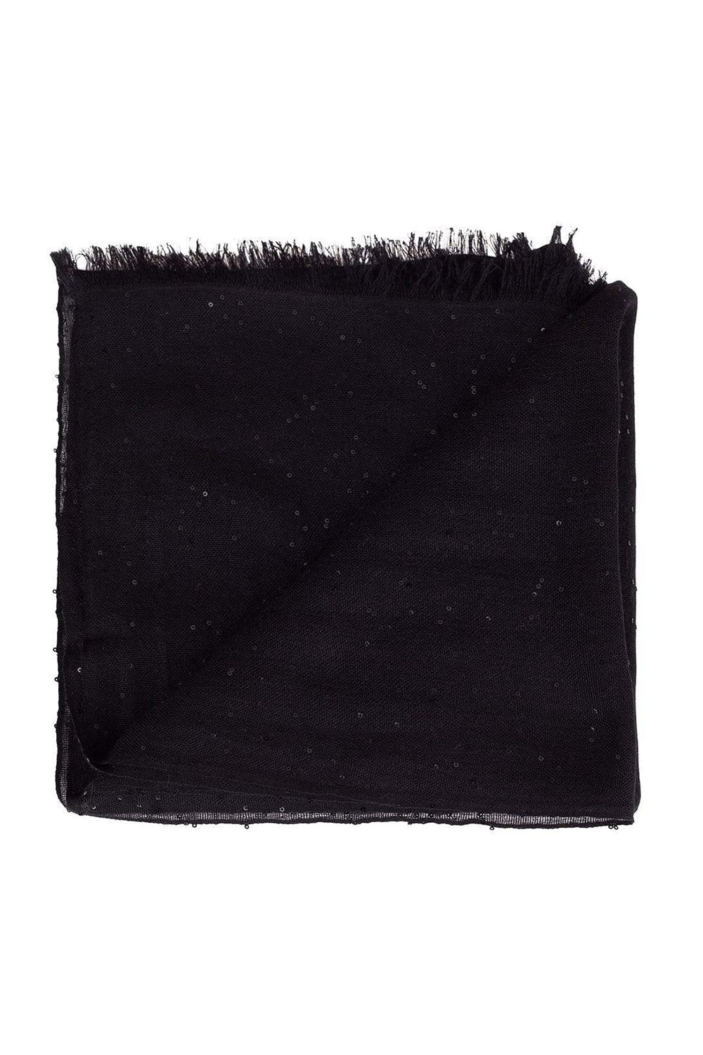 DETAILS AND INSIGHT This Brunello Cucinelli scarf offers just enough comfort and sophistication, featuring a hint of sparkle with scattered paillettes on a blend of soft luxurious cashmere and silk. 70% Cashmere, 30% Silk, Dry Clean Made in Italy, 84” L x 62” W Style MSCDVSW03-C101