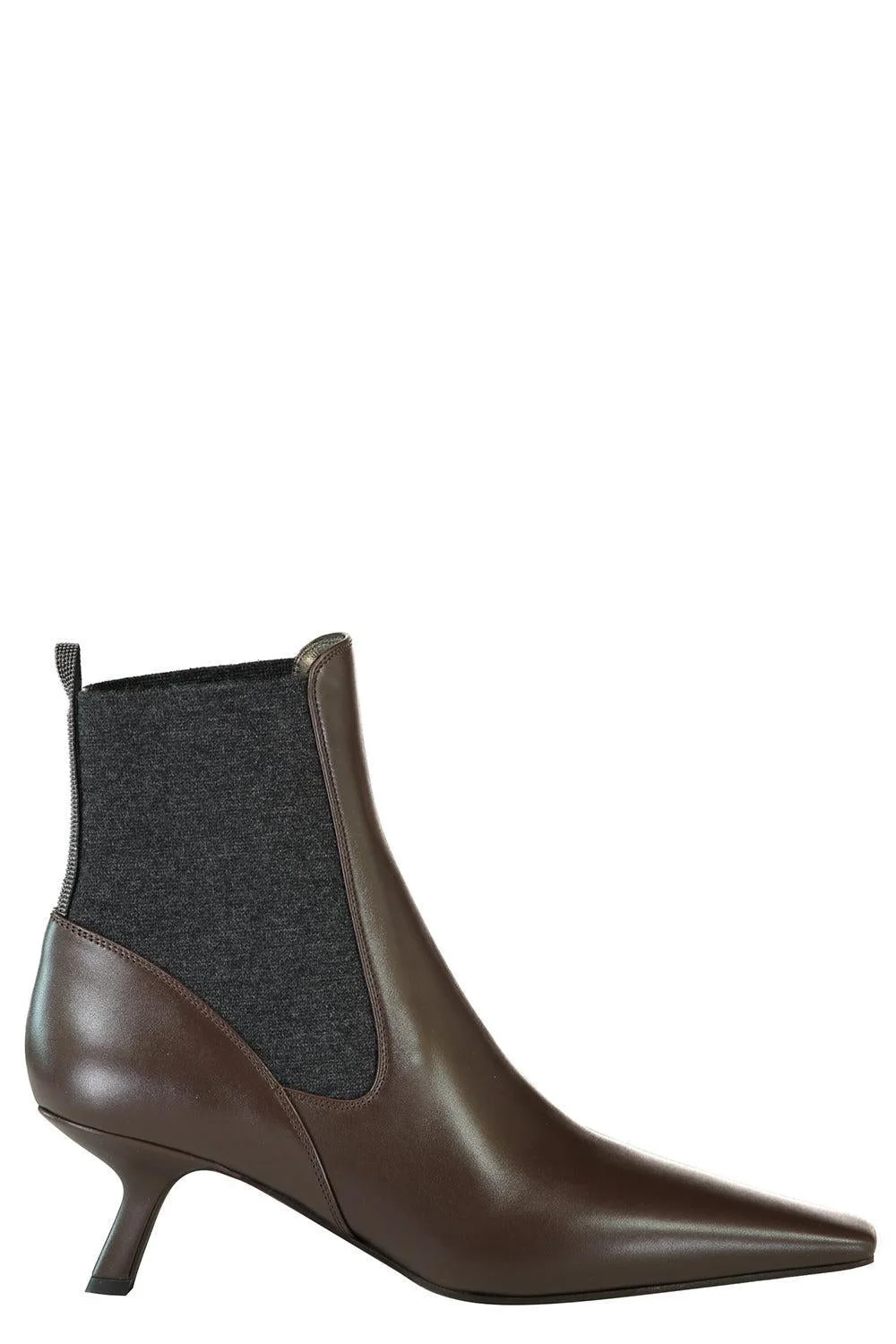 DETAILS AND INSIGHT Brunello Cucinelli kitten heel ankle boot in dark brown. Leather Heel Height: Made in Italy Ships by Aug 7 Style MZSKC3054P-C8279