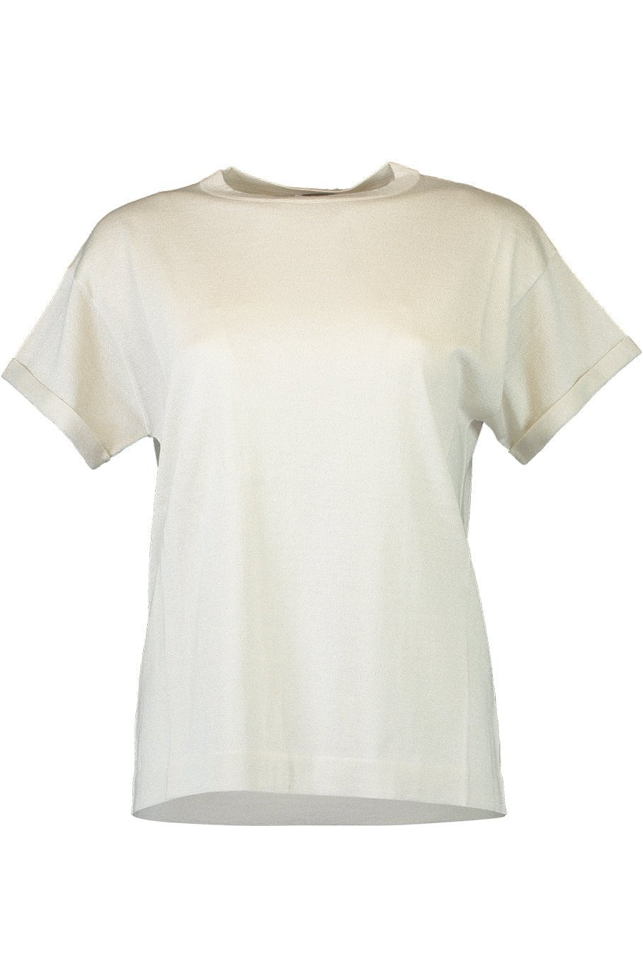 DETAILS AND INSIGHT Brunello Cucinelli lurex t-shirt in pearl. 51% cashmere, 22% silk, 20% polyamide, 7% polyester Dry clean Made in Italy Style M41810000-C9443