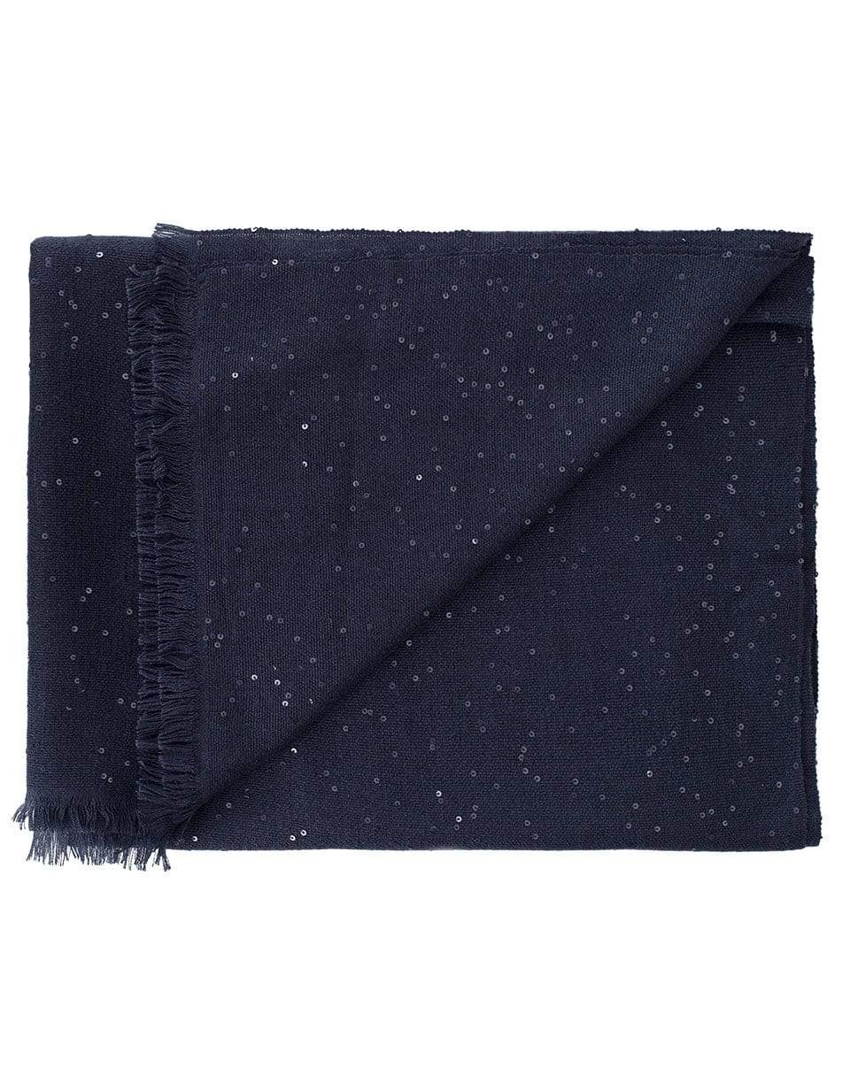 DETAILS AND INSIGHT Brunello Cucinelli midnight cashmere, silk, and paillette scarf. 70% Cashmere, 30% Silk, 100% Paillettes, Dry Clean Made in Italy, 72" x 38" Style MSC915029-C7186