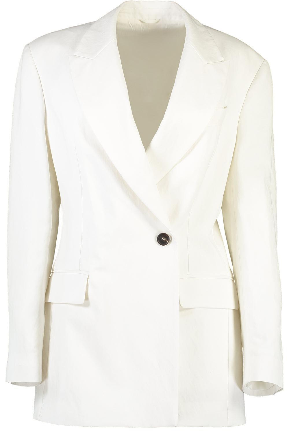 DETAILS AND INSIGHT Brunello Cucinelli one button blazer in cream white. Off-Centre Front Button Fastening, Two Side Flap Pockets, Peak Lapels, Buttoned Cuffs Paper Yarn 58%, Viscose 42% Dry Clean Made In Italy Style MH5407260-C600