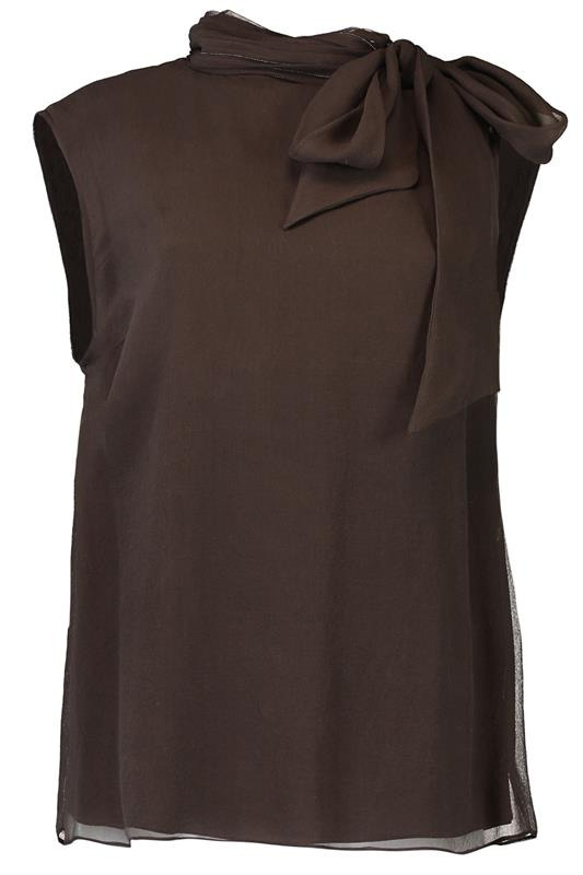 DETAILS AND INSIGHT Brunello Cucinelli sleeveless tie neck blouse in dark chocolate. Silk Chiffon Dry Clean Made in Italy Style MF940ED804-C4222