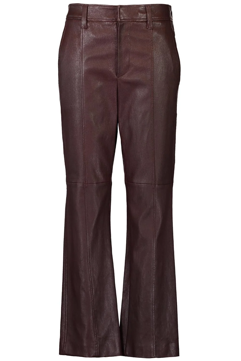 DETAILS AND INSIGHT Brunello Cucinelli stretch crop pant in bordeaux. Stretch Leather Mid Rise, Kickflare Dry Clean Made in Italy Style M0V32P9048-C4193