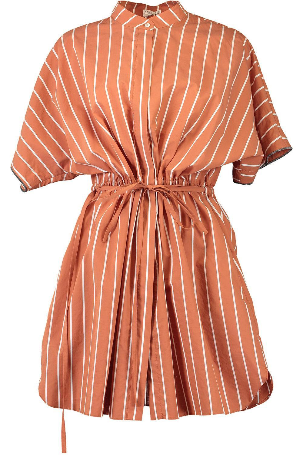DETAILS AND INSIGHT Brunello Cucinelli stripe cinch waist dress in orange/panama. Techno Cotton Dry Clean Made in Italy Style MPB40A5353-C8010