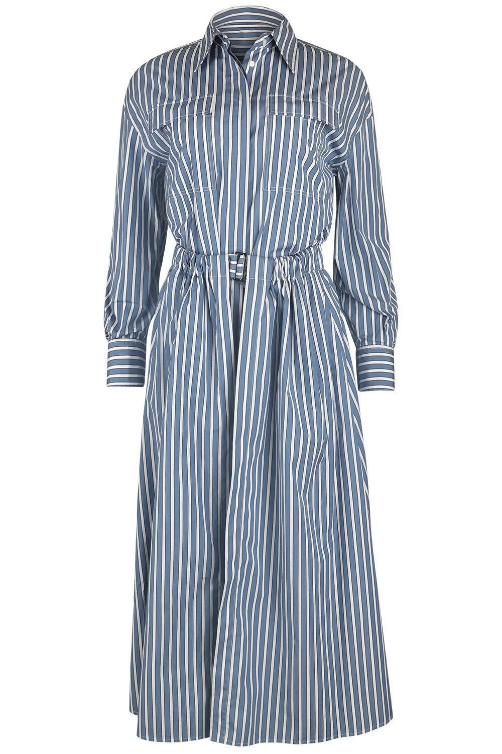 DETAILS AND INSIGHT Brunello Cucinelli wide stripe skirt overlay shirt dress in light blue, brown, white. Removable Belt Cotton Dry Clean Made In Italy Style MH749A5465-C001