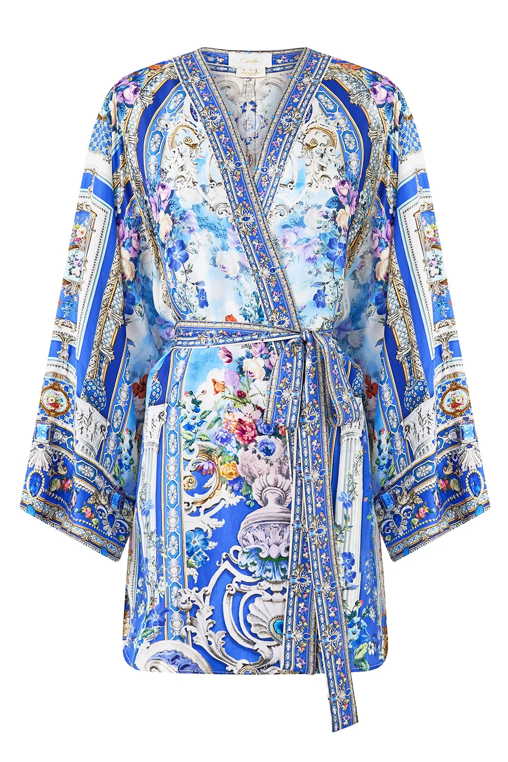 DETAILS AND INSIGHT Camilla short kimono wrap in ottoman opulence. 100% Silk Dry Clean Made In India Style 00038113-OTTOOPPU