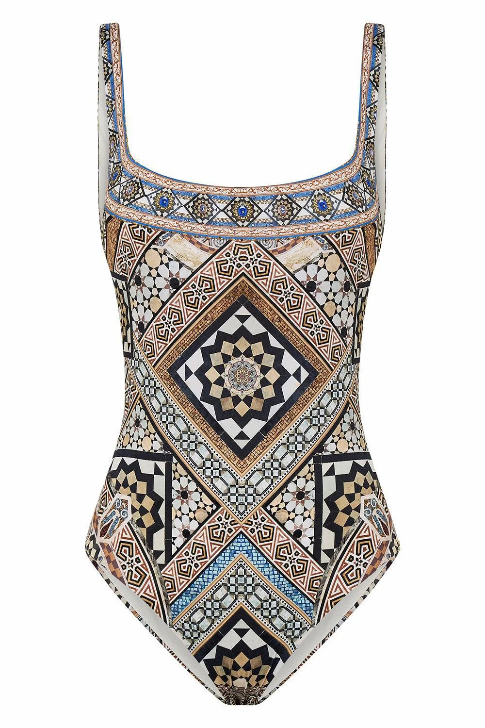 DETAILS AND INSIGHT Camilla underwire square neck one piece in make me your mosaic 82% POLYAMIDE, 18% ELASTANE Dry Clean Imported Style 00032307-MMYMOSAC