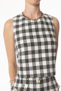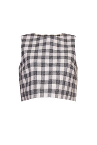 DETAILS AND INSIGHT Cara Cara debbie top in black ivory boucle grid. 62% Cotton 18% Viscose 17% Poly 3% Other Dry Clean Only Made In China Style 3136-BIBG