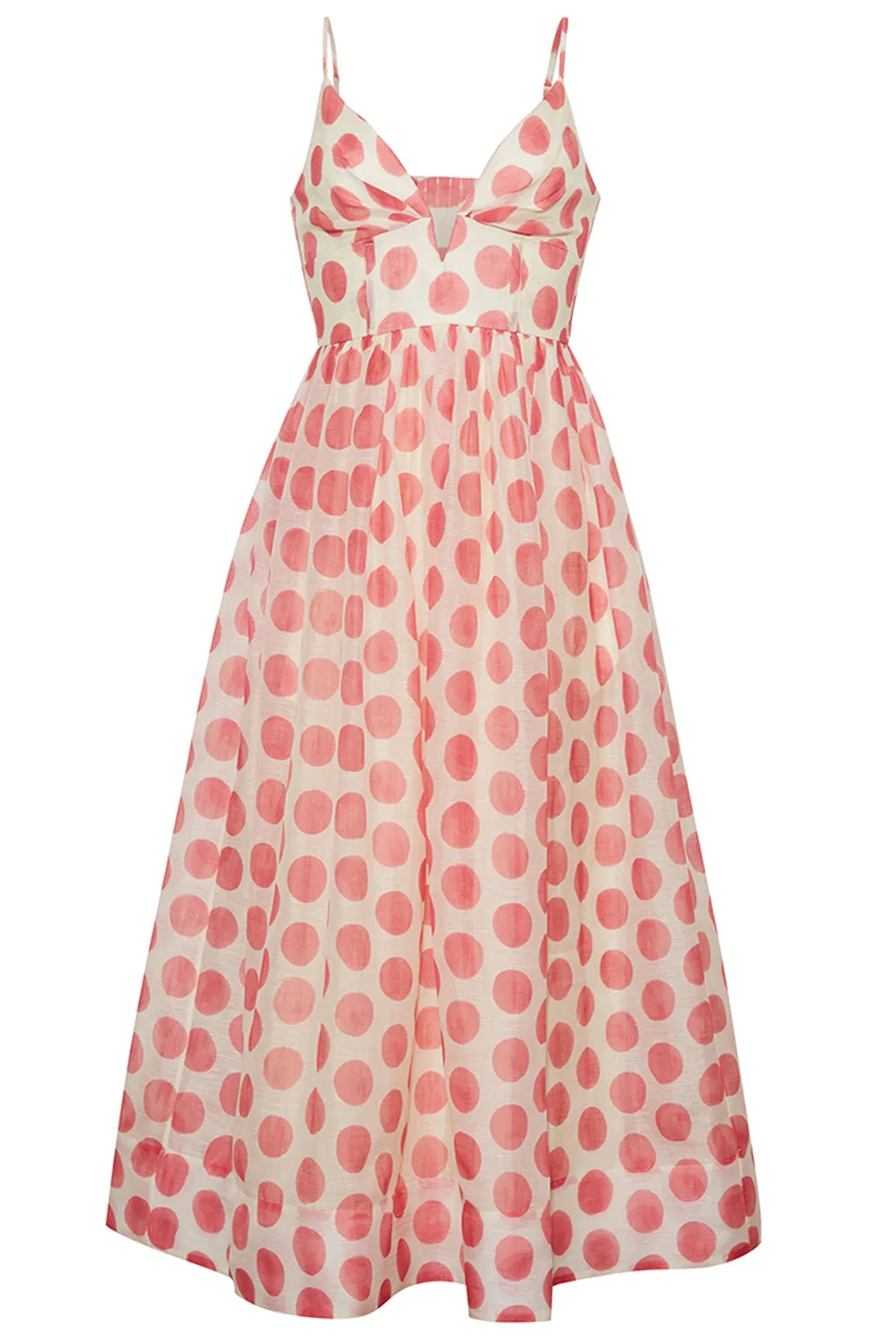 DETAILS AND INSIGHT Cara Cara pero midi dress in celeste spot pink. Silk Linen Organza Dry Clean Only Made In China Style 1529SLO-CSPP