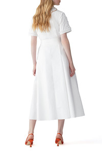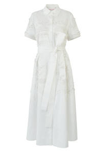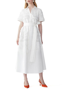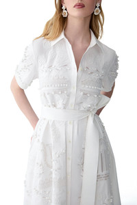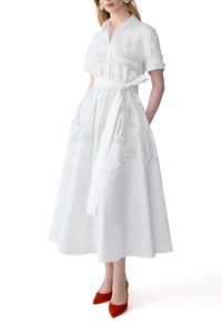 DETAILS AND INSIGHT Carolina Herrera embroidered shirt dress in white. Removable Belt 97%Co 3%Pu Dry Clean Made In India Pre-Order ships by Feb 7 Style R2611E544SCT-100