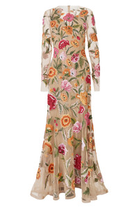 DETAILS AND INSIGHT Carolina Herrera long sleeve embroidered gown in nude. 100% Pa Dry Clean Made In India Pre-Order Ships by Feb 7 Style R2611E709NTU-252