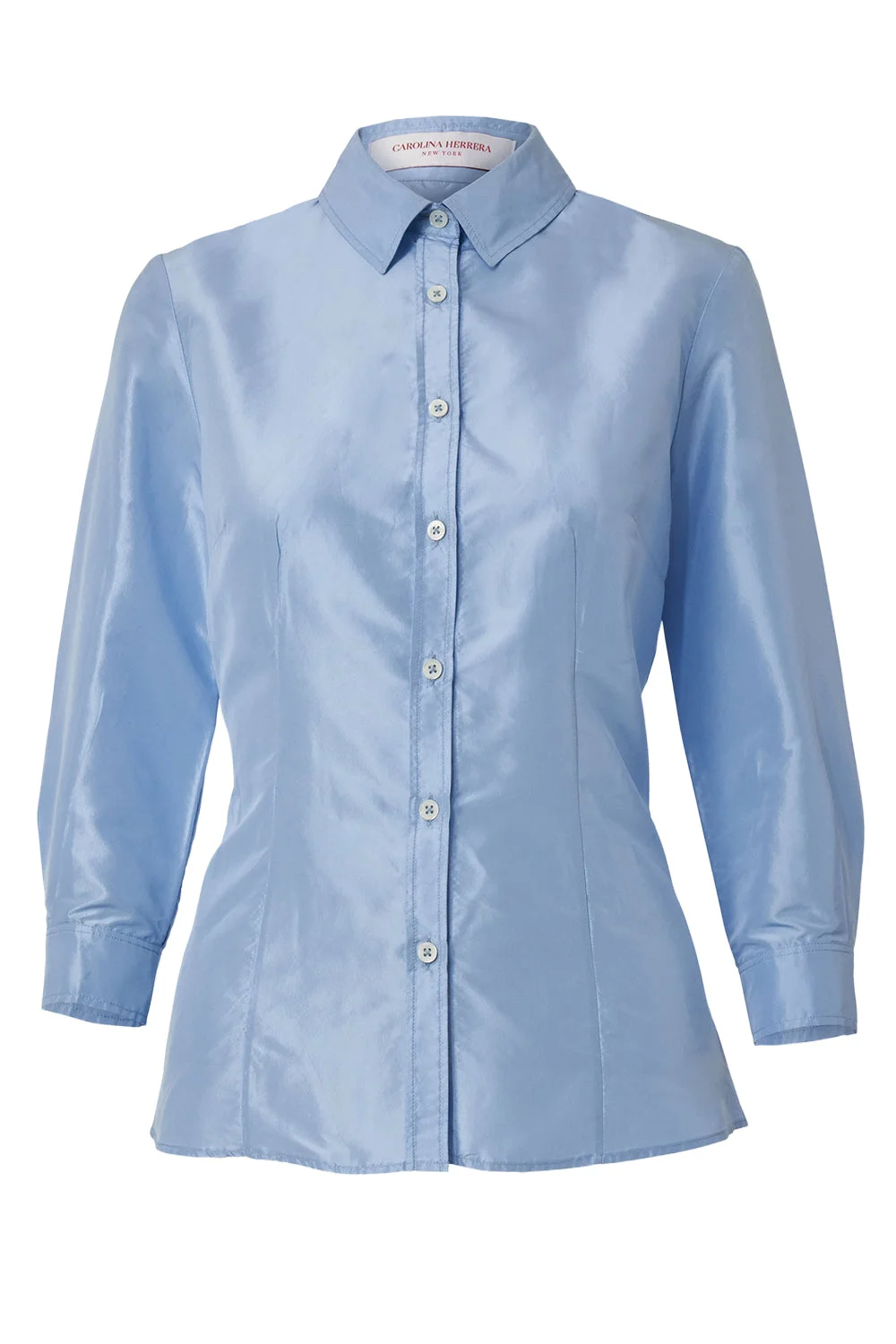 DETAILS AND INSIGHT Carolina Herrera taffeta shirt in sky blue. 100% Silk Dry Clean Only Made In Italy Style 2097TAF-497