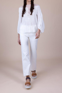DETAILS AND INSIGHT Chloe flare boyfriend jeans in white. 87% Cotton, 13% Hemp; Pocket lining: 65% Polyester, 35% Cotton High Rise Dry Clean Made in IT Style CHC24SDP03154-101