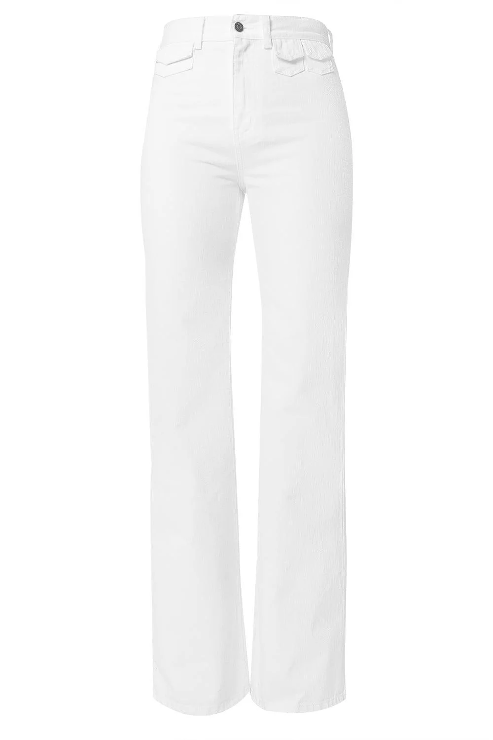 DETAILS AND INSIGHT Chloe flare jeans in white. 100% Cotton, Patch: 100% Calfskin Hi Rise, Flare Leg Gentle Wash Hot Made in Italy Style CH25UDP03150-101